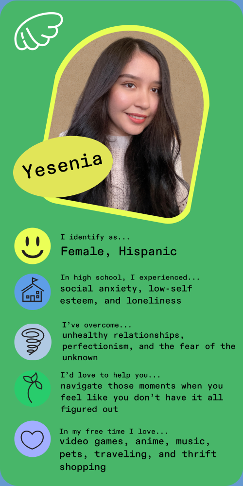 “Growing up in a single-parent household, I struggled with feelings of loneliness and abandonment. Learning how to regulate my emotions and improve my relationship skills really changed the way I perceived myself and everything around me. As a mentor, my goal is to help you practice identifying negative thought patterns and behaviors to support your well-being and relationships.”